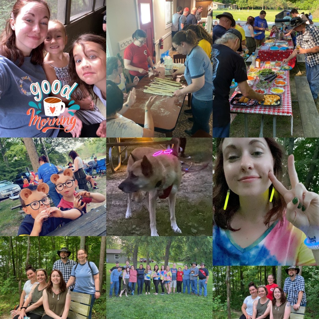 This set was from a few different trips to our favorite place in town: TinCap Cidery! We all tried several different ciders and beens, as well as some good food. My favorite cider is the one pictured twice: mango and hatch chili. Sweet with a nice kick at the end! It’s closely followed by the raspberry (also pictured) and the peach. One of the times we went was the whole group, the other was a smaller section of the herd. Not featured but highly important: this is a dog friendly establishment, and one of the owners has a handsome large poodle named Cappy, who is the employee of the month.These are from our day trip to King’s Island, a pretty cool theme park (that was doing a fun Grand Carnivale theme). It was only a small group of us that went, but we spent about half the day running around and living our best little theme park lives. Bonus thing: I got a beverage towards the end that was strawberry, lime, and Prosecco that came in a large souvenir cup that lights up in fun patterns at the base! Very refreshing after a long day in the sun.This collection is just random fun things that I caught pictures of. There’s some of my littlest cousins (all of whom are adorable and crazy), as well as my generation of cousins (missing two of them that weren’t able to be there) and the full Frank Martino branch (my grandpa). Our branch handmade gnocchi for our dinner of the week, which took a good portion of the day and was very fun! We made glowstick jewelry one night, had s’mores, and did so much other cool stuff that I did not get or only caught on video. In the central place of honor: my favorite cousin, Smokey! He belongs to the two lil bear boys.